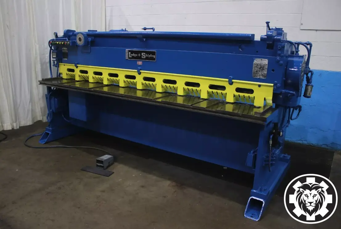 LODGE & SHIPLEY 0210-SL Mechanical Shear, 10 GA capacity, 120" cutting length. Equipped with a 48" front-operated power back gauge, 10 hold downs, and a 10 HP motor. Features include a 3/16" rake angle and 60 strokes per minute.
