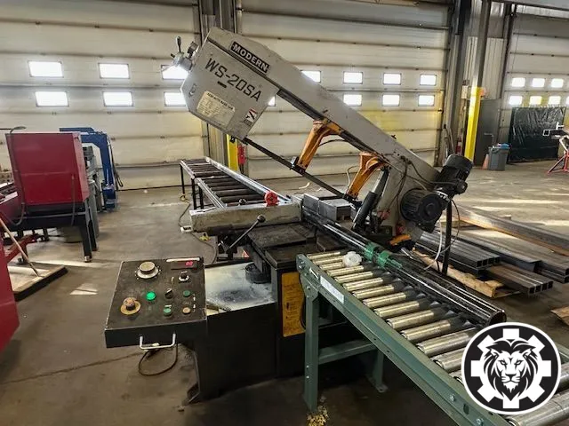 Modern WS-20SA Horizontal Bandsaw, used but in good condition. Comes with conveyors. Specs: Semi-auto, 330x460mm cutting capacity at 90°, 3 HP blade motor, 34x1.1x4130mm blade, adjustable speed 21-93 mpm. Ideal for precise jobs.