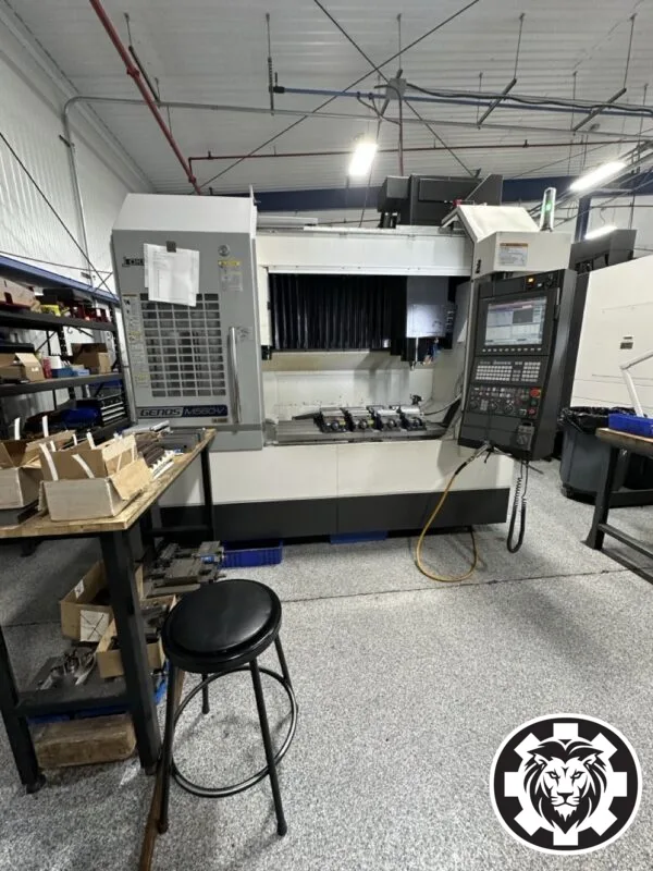 OKUMA Genos M560V CNC VMC, 2018 model with LNS hinge belt conveyor. Features X/Y/Z: 1050/560/460 mm, 30 hp, 15,000 RPM, ATC: 32, Taper: #40. Ideal for precision and efficiency in vertical machining tasks.