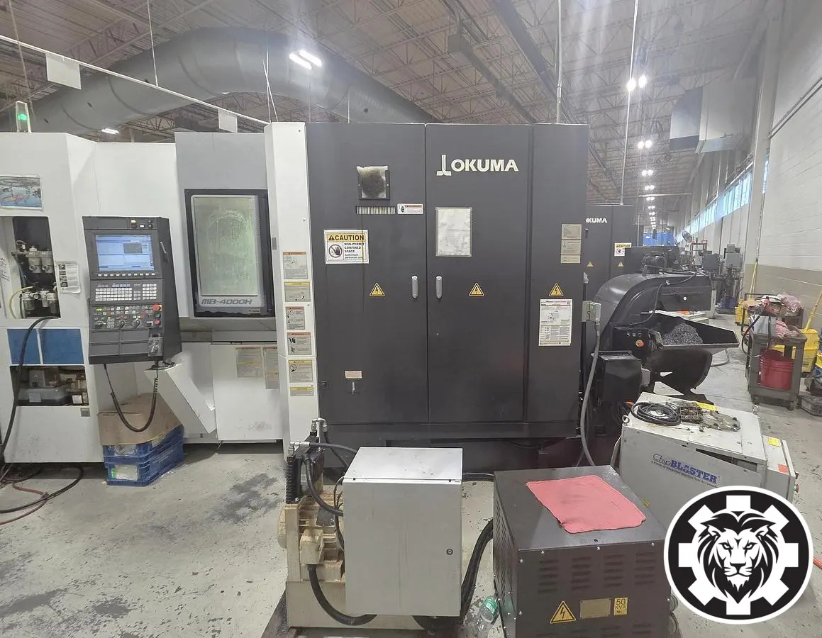 OKUMA MB-4000H Horizontal Machining Center, 2019, used condition. Features 22" X/Y travel, 24" Z travel, 40 HP, 15,000 RPM, 64-tool ATC, and 3-axis capability, with a 15.7" x 15.7" pallet and 40 Big Plus taper.
