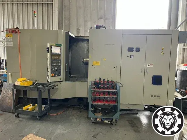 KIWA KH-45 Horizontal Machining Center, 2008 model, used. Specs: X 25.157, Y 23.978, Z 26.73, 15000 RPM, 120 ATC, Pallet 15.723 x 15.723. Ideal for precision tasks, offering reliable performance with a compact footprint.