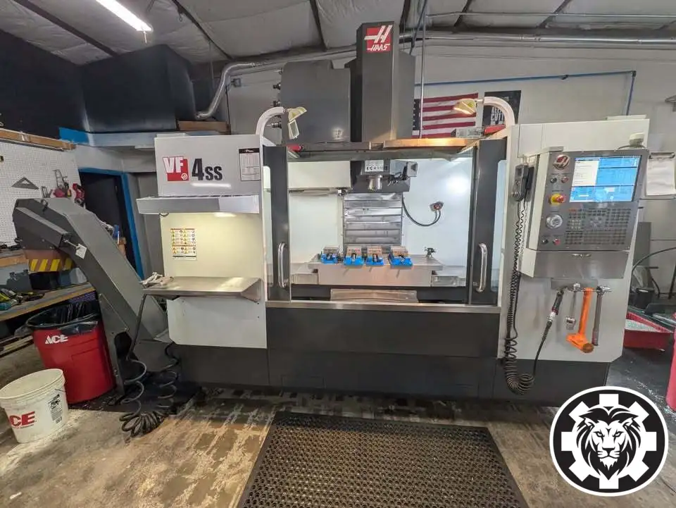 Haas VF-4SS VMC, 2013: Low hours, 12,000 RPM, 30 hp, 50"x20"x25" travel, CAT40 taper. Features wireless probing, high-speed machining, thru-spindle coolant ready, and expanded memory. Power: 220V 3 Phase. Ideal for precision and efficiency.