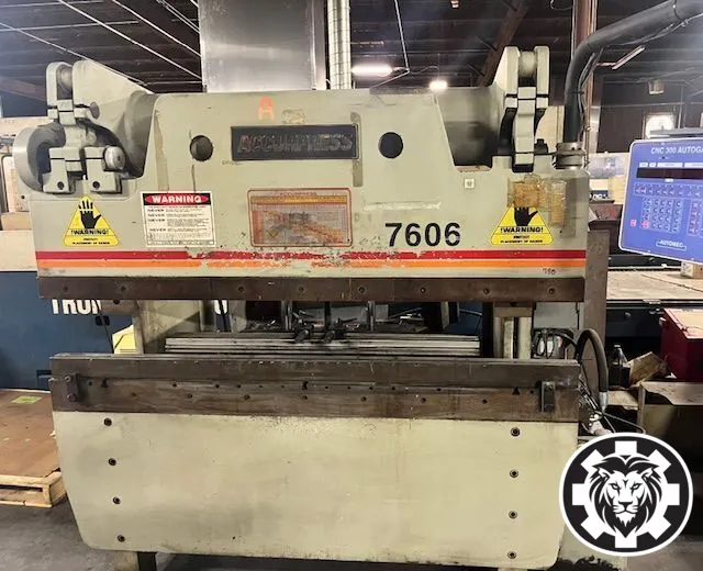 Optimize your metal forming process with this used 1998 ACCURPRESS 7606 press brake. Featuring 60-ton hydraulic capacity, a 6ft overall length, and 3-axis control, it's engineered for precision and durability. Ideal for enhancing your production line.