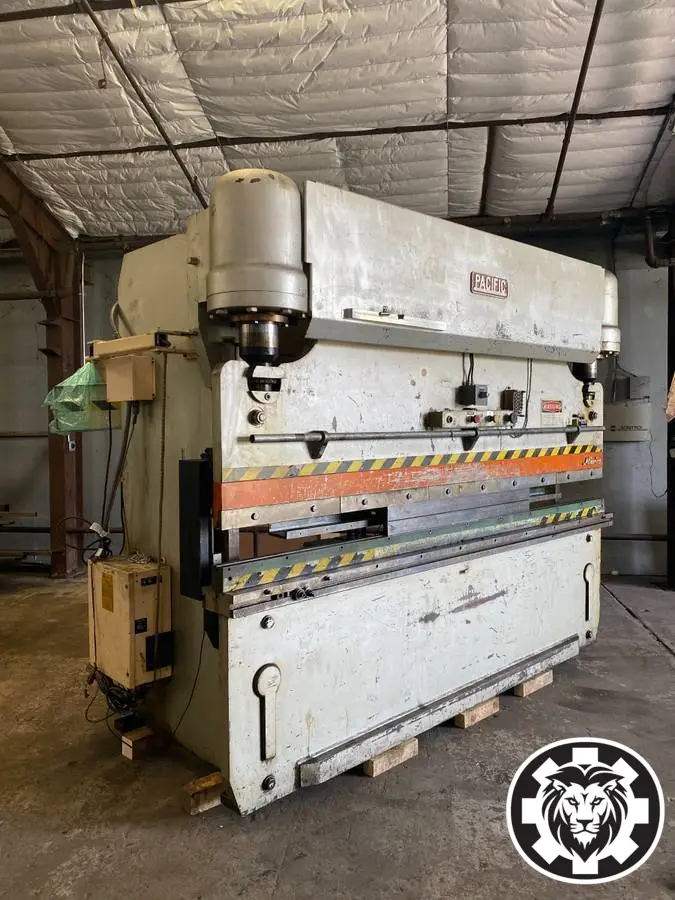 PACIFIC J135-10 used hydraulic press brake. 135-ton capacity, 10-foot length, 102-inch between housings, with a 10-inch stroke. Ideal for precise metal bending tasks in industrial settings.